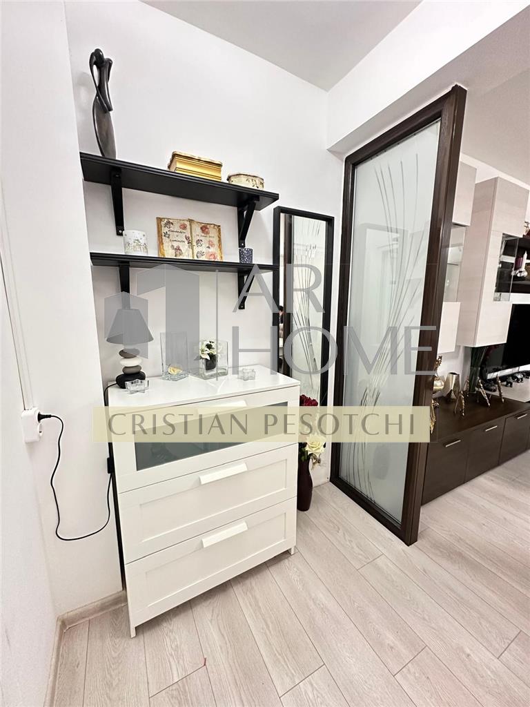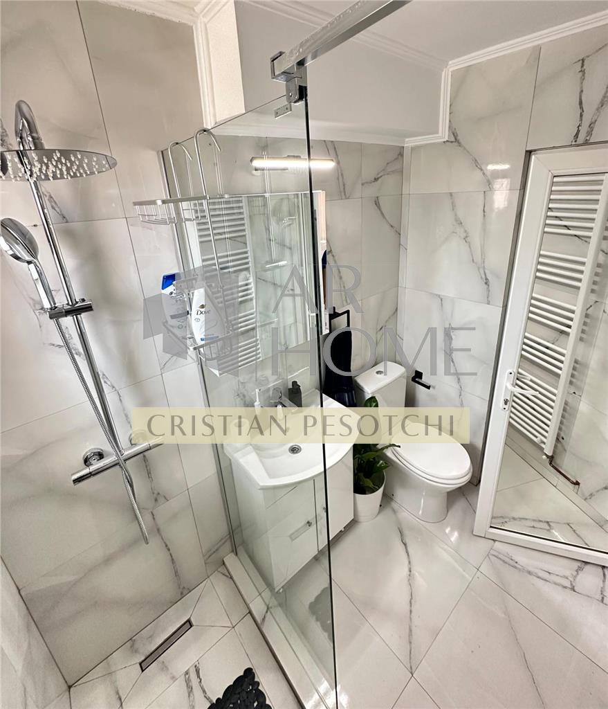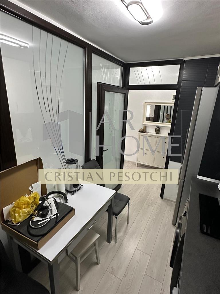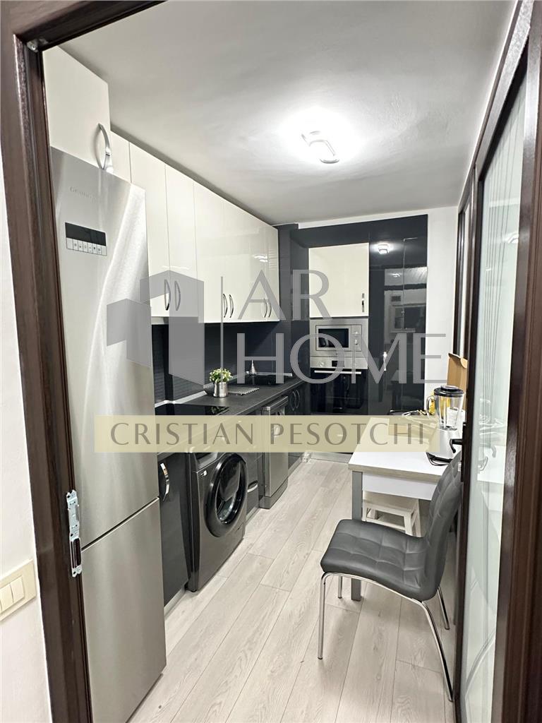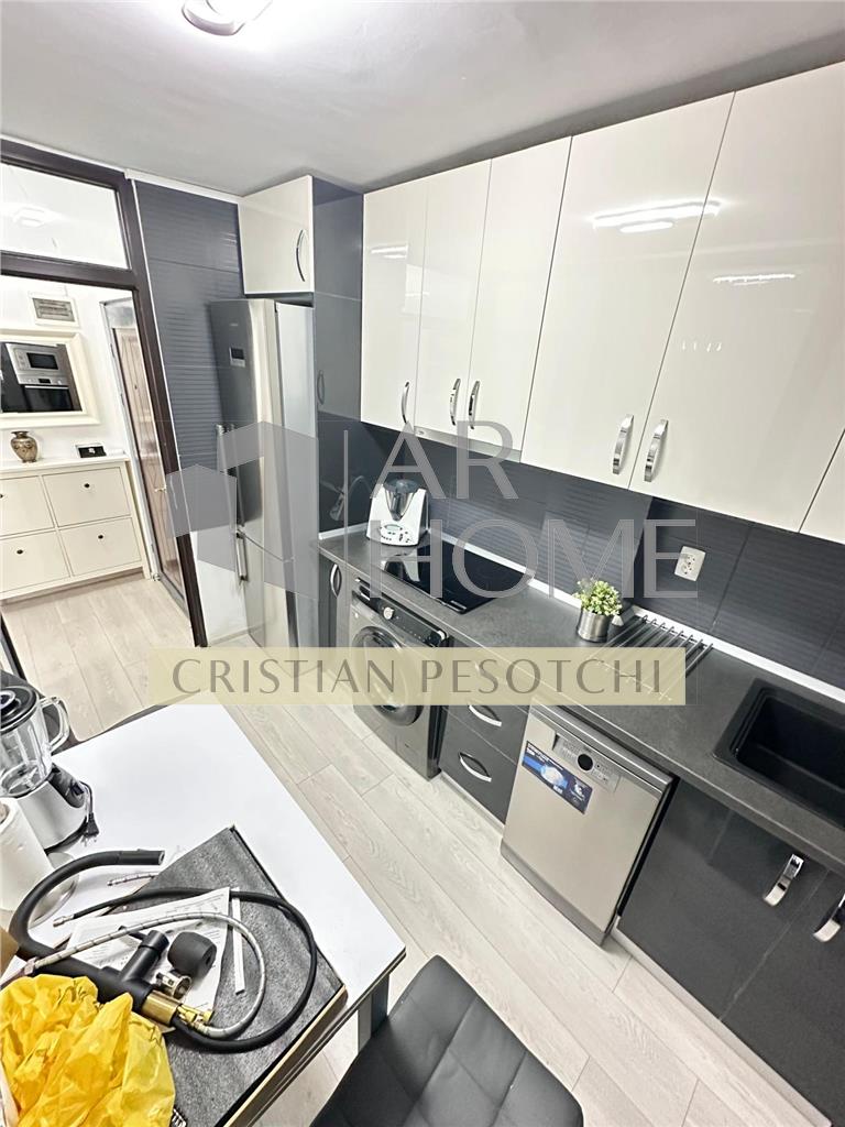 Bucătărie complet mobilată și utilată modern cu electrocasnice, instalatie electrica noua,lustre cu ventilatie si telecomanda,plita inductie cu circuit electric separat, wc cu bideu incorporat,rulouri exterioare, mobilier, aer conditionat, totul in apartament este nou.(nu este si nu a fost locuit de la renovarea totala recent efectuata).