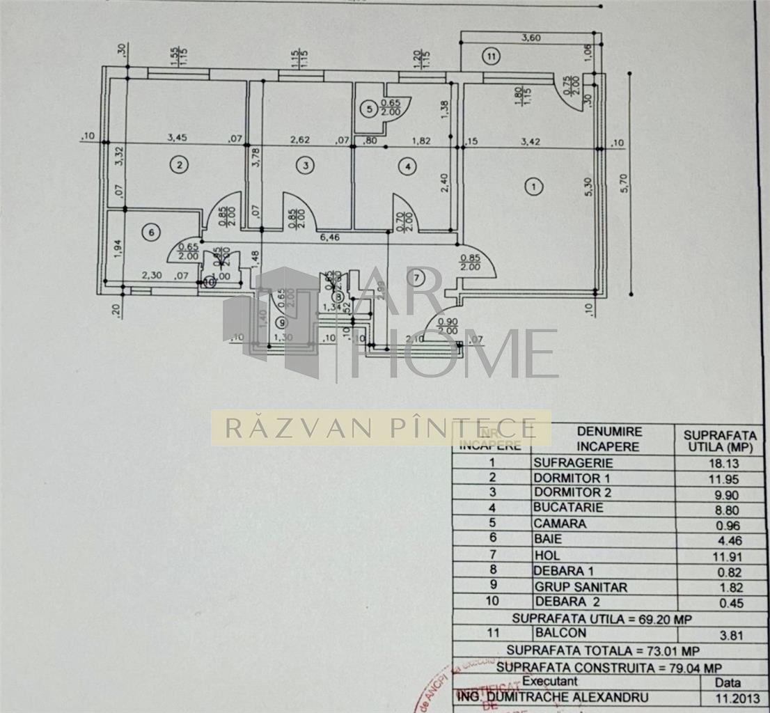 Suprafata utila este de 69,20 mp + balcon 3,81 mp. Este compartimentat conform planului atasat.