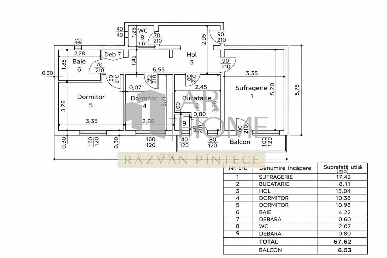 Suprafata utila este de 67,62 mp + balcon 6,53 mp. Este compartimentat conform planului atasat.
