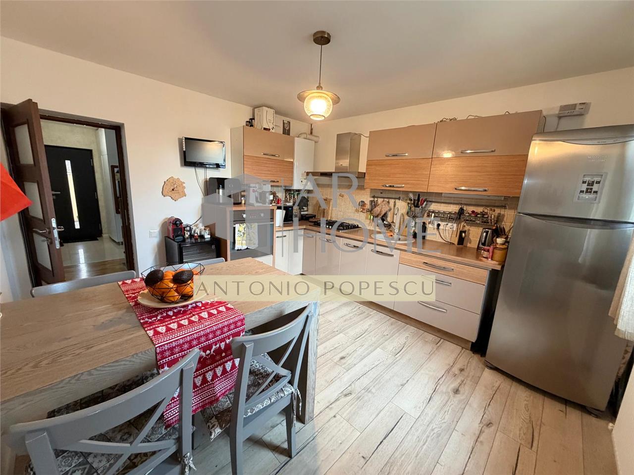 Parter- hol si casa scarii (10,5 mp), living si dinning (27,8 mp), bucatarie (13,45 mp), baie (3,4 mp), camara, terasa;