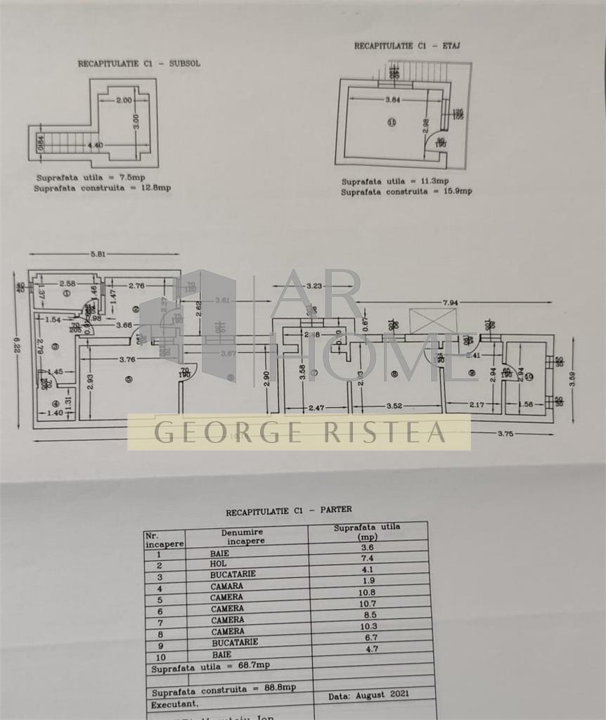 Living + 4 dormitoare, beci zidit 7.5 mp, suprafata totala construita 135 mp, suprafata utila 115 mp si suprafata teren 180 mp. Deschiderea este de 10 ml. Imobilul are amprenta 135 mp, curtea individuala libera 50 mp.