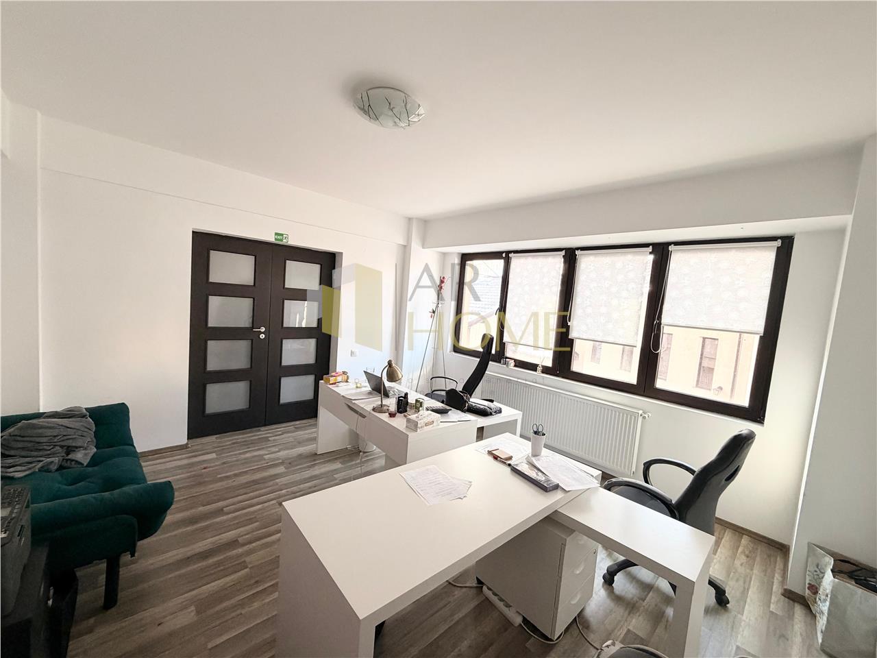 Dotari : tamplarie PVC , usi interioare celulare cu sticla , parchet laminat , gresie si faianta in baie , centrala proprie Buderus , aer conditionat , mobilier office , bucatarie utilata , grup sanitar , lavabil alb , calorifere aluminiu , si contoare de gaz , electricitate si apometre separate.